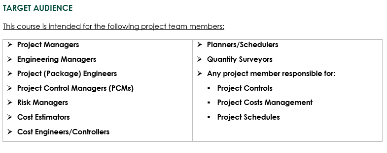 3. No Special Software is Required. After training, candidates can apply this course’s methodology to any existing schedule and cost-control software, tools, or systems.