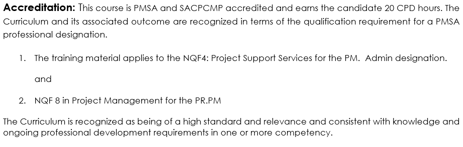 1. Receive Accreditation of 20 Continuing Professional Development CREDITS (or CPDs) from PMSA and SACPCMP, plus a Certificate of Competency, upon passing the course.