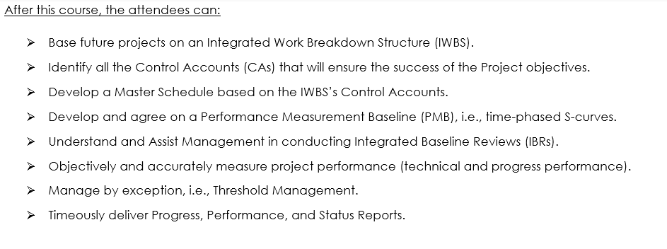4. One Integrated WBS (or IWBS). Attendees learn “HOW TO” incorporate the scope, schedule, and budgets at control account levels. When the entire team works from ONE Integrated WBS (or IWBS), Stakeholders have more confidence in progress, performance, and status reports.